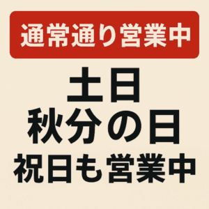 明日 9月23日(火・秋分の日)も、朝9:00〜夜20:00まで通常通り営業 しております。祝日も休まず診療しておりますので、平日お仕事や家事で忙しい方も安心してご来院いただけます。